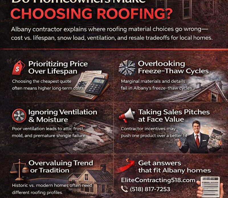 We’ve installed and replaced thousands of roofs across Albany, Troy, Schenectady, Saratoga, and the hill towns over the last 16+ years. When Albany homeowners ask what goes wrong in material selection, we think about real houses we’ve touched: 1890s row homes in Arbor Hill, 1950s ranches in Colonie, and newer colonials in Clifton Park. The patterns repeat. Decisions that look fine on paper fall apart under Capital Region weather, roof pitch, and snow load.